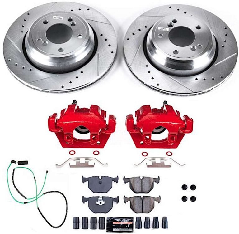 Powerstop KC4875 Front Brake Disc and Caliper Kit, Cross-drilled and Slotted 5 Lugs 294.9 mm Red Powdercoat Caliper, Carbon Fiber Ceramic, RWD, Z23 Evolution Sport Series