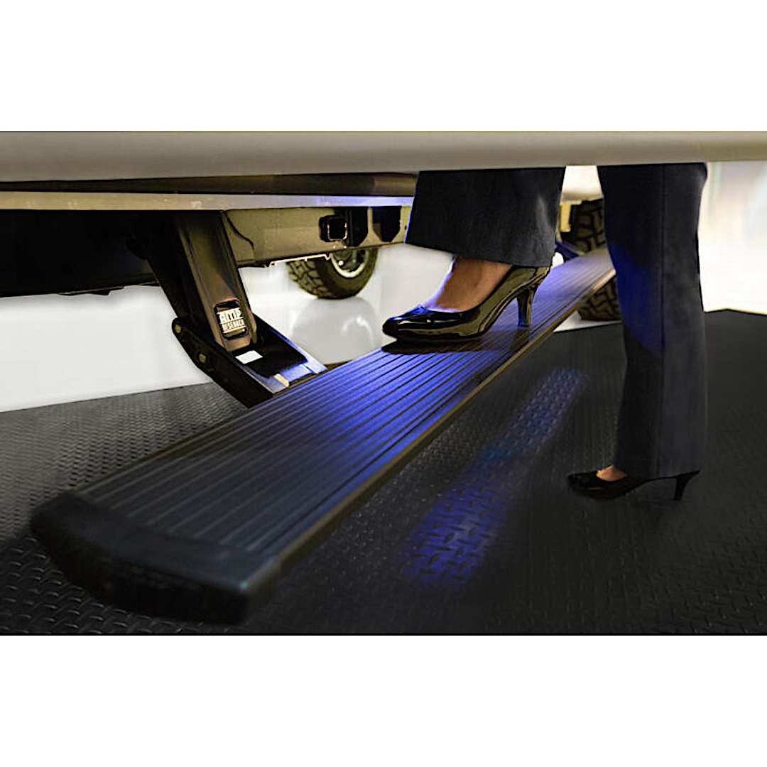 AMP Research’s PowerStep automatic running boards are, simply put, brilliant. Open the door of your truck or SUV and the PowerStep swings down to help you in, then as soon as you shut the door it tucks neatly under the vehicle. Engineering at its finest.