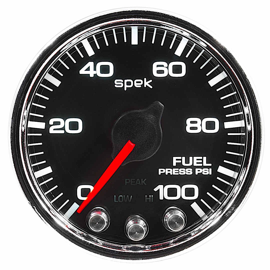 Autometer P31431 Spek Series Gauge, Fuel Press, 2 1/16in. 100Psi, Stepper Motor W/Peak & Warn, Blk/Chrm.