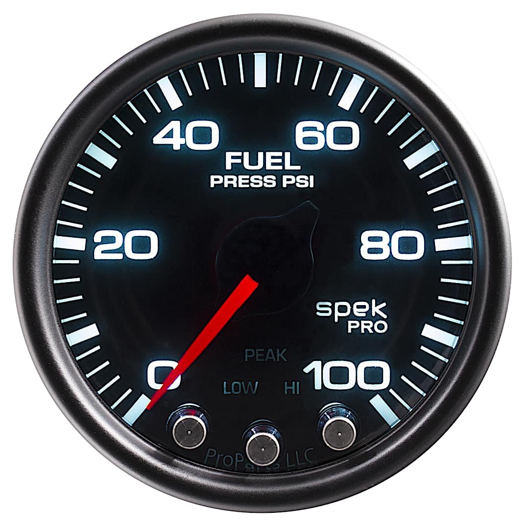 Autometer P31452 Spek Series Gauge, Fuel Press, 2 1/16in. 100Psi, Stepper Mtr W/Pk & Wrn, Blk/Smoke/Blk.