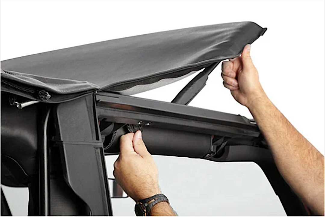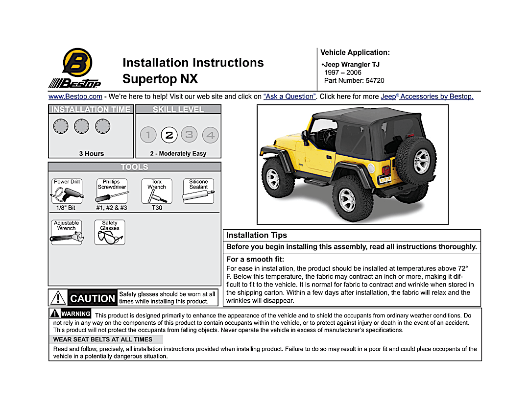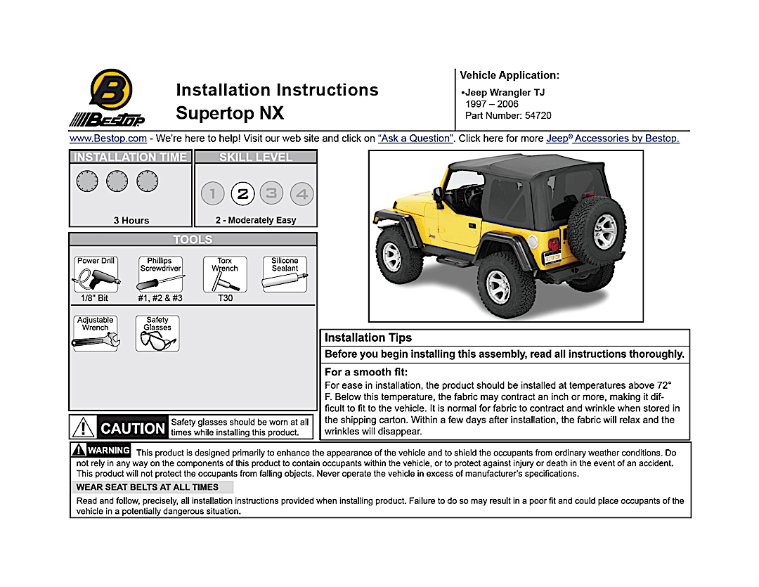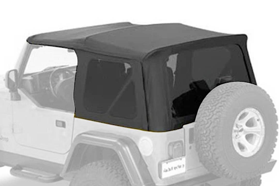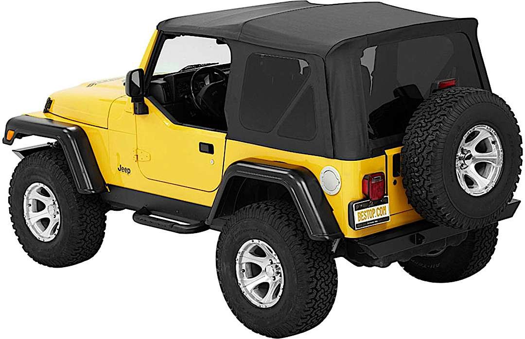 Supertop Complete Top With OEM Style Hardware. Bestop’s Factory Style Soft top complete with factory style door surrounds, factory style windshield channel, sailcloth fabric, and tinted windows. PLUS, a Top Arch to support the fabric, quick release bow knuckles for tool less top removal, and a new adjustable plate to maintain top tautness. High grade premium fabric. High Strength steel and OEM composite plastic hardware. Fold back sunroof feature, standard, except on YJ model. Multiple door kits available. Full Soft Top kit available for TJD applications. Two Year Warranty.