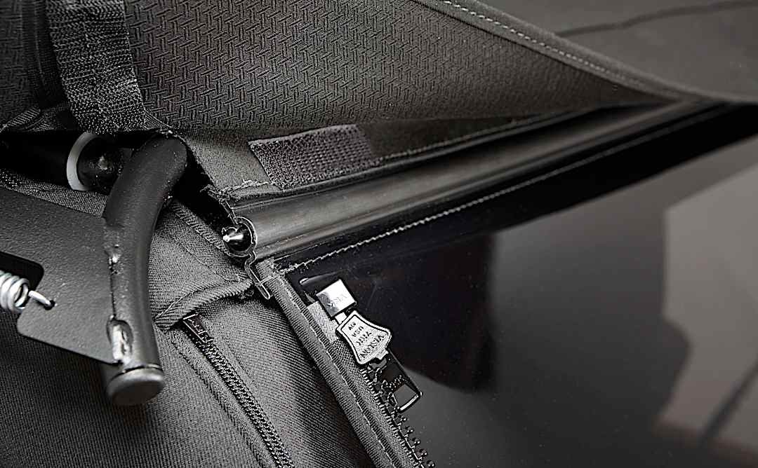 The Trektop brings a tight, clean fabric soft top look to your Jeep. Run it as a fully-enclosed, all-season soft top for protection from the elements or remove the sides and rear window and enjoy it as a bikini allowing you to feel the breeze as you experience your outdoor adventure. Zippered pockets above the driver and passenger provide for organization of small gear items. Zipperless technology allows for an improved fit and easier installation. Use of the tailgate bar and clips allows for hassle-free opening of the tailgate.