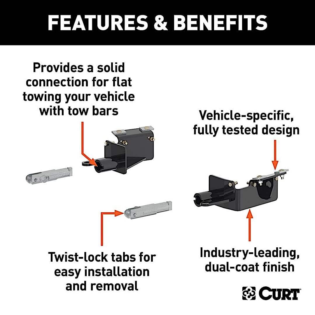 This CURT tow bar base plate offers a custom, vehicle-specific fit. It integrates with the vehicle frame, securely bolting into place and providing a solid attachment point for dinghy towing. Each CURT base plate is constructed from welded steel and physically tested for safe towing.