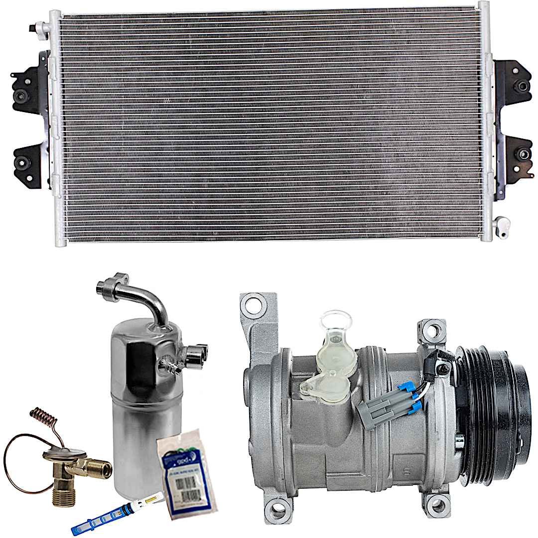 (1) A/C Compressor ,(1) A/C Condenser ,A/C Expansion Valve ,A/C Orifice Tube ,and (1) A/C Service Kit (A/C Accumulator ,and A/C O-Ring and Gasket Seal Kit) |