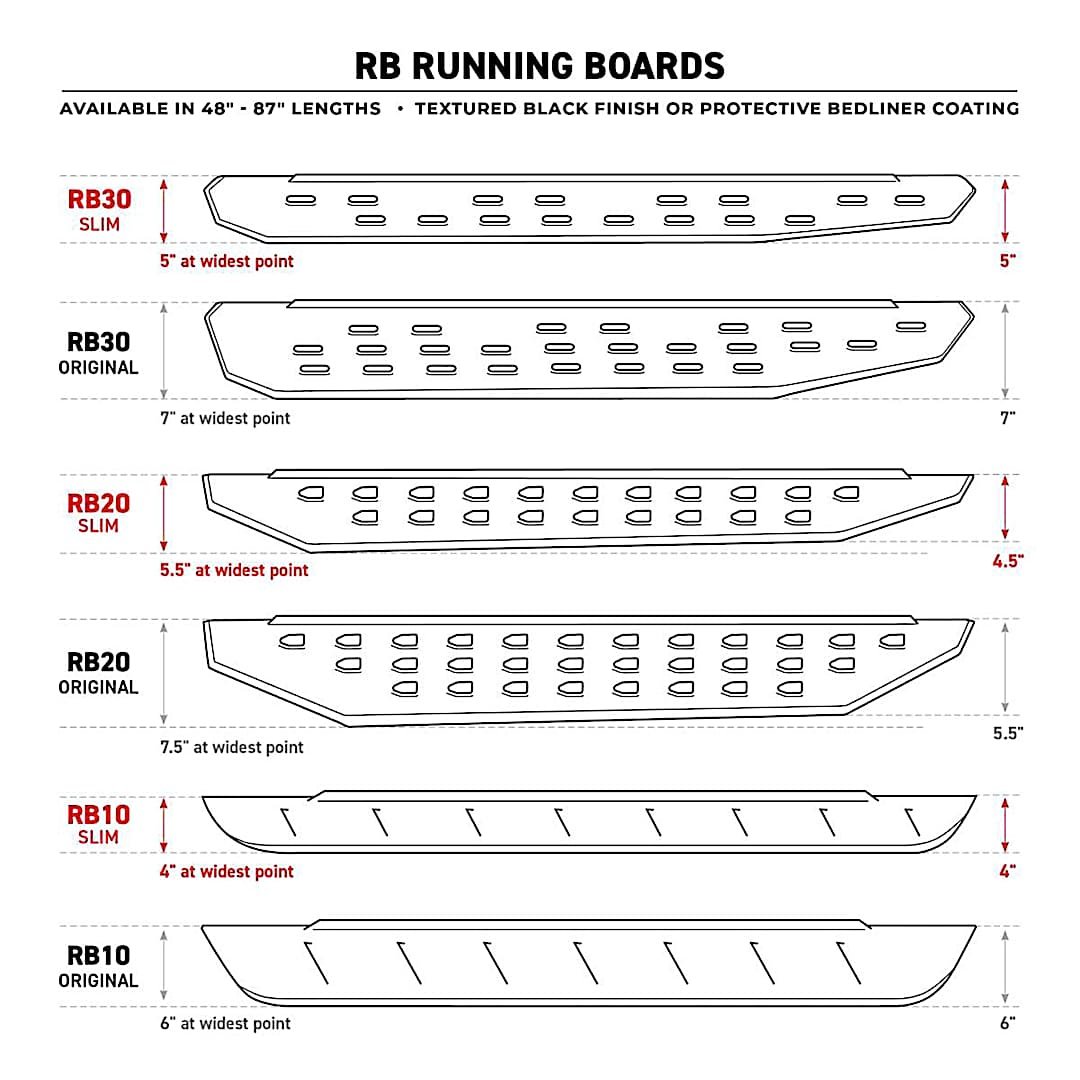 The Go Rhino RB10 Running Boards feature a generous step area with Raptor-style louvers for maximum traction. The corrosion-resistant 16-gauge zinc coated steel steps are mounted high and tight, giving them plenty of clearance for off-road adventures, and are strong enough to support hundreds of pounds of weight.