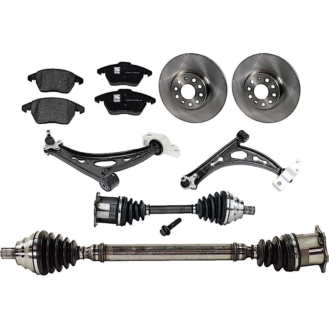 JC Whitney 8-Piece Kit Front Axle Assembly, includes (2) Axle Assembly, (2) Brake Disc, (1) Brake Pad Set, and (2) Control Arm, Sedan, Diesel, Automatic Transmission, Secondary Design