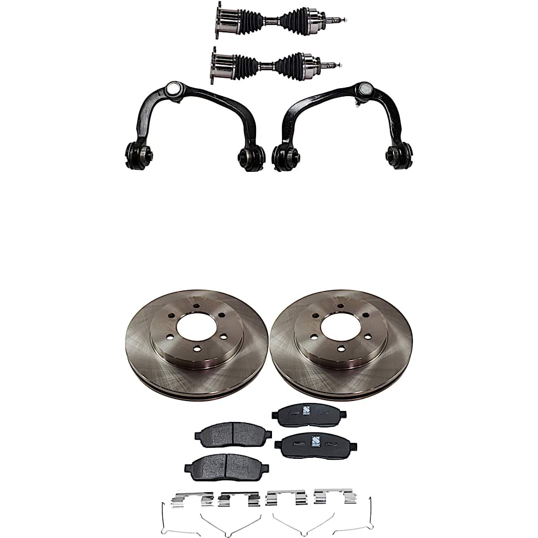 JC Whitney 8-Piece Kit Front, Driver and Passenger Side Axle Assembly, Supplied with Standard Neoprene Outboard Boot, New, includes (2) Axle Assembly, (2) Brake Disc, (1) Brake Pad Set, and (2) Control Arm
