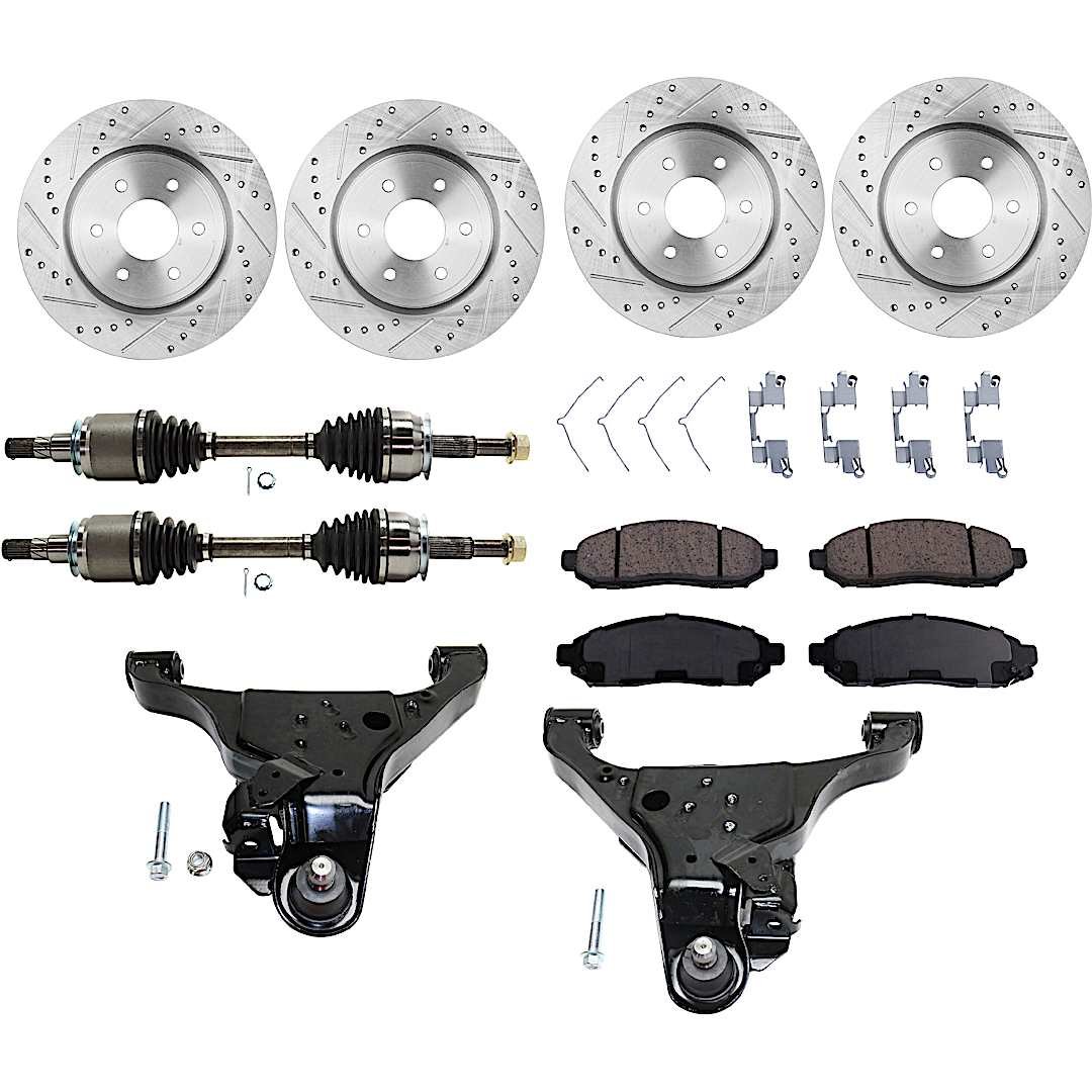 JC Whitney 8-Piece Kit Front, Driver and Passenger Side Axle Assembly with Brake Discs, Brake Pad Set, and Control Arms, 4WD, 4.0L Engine