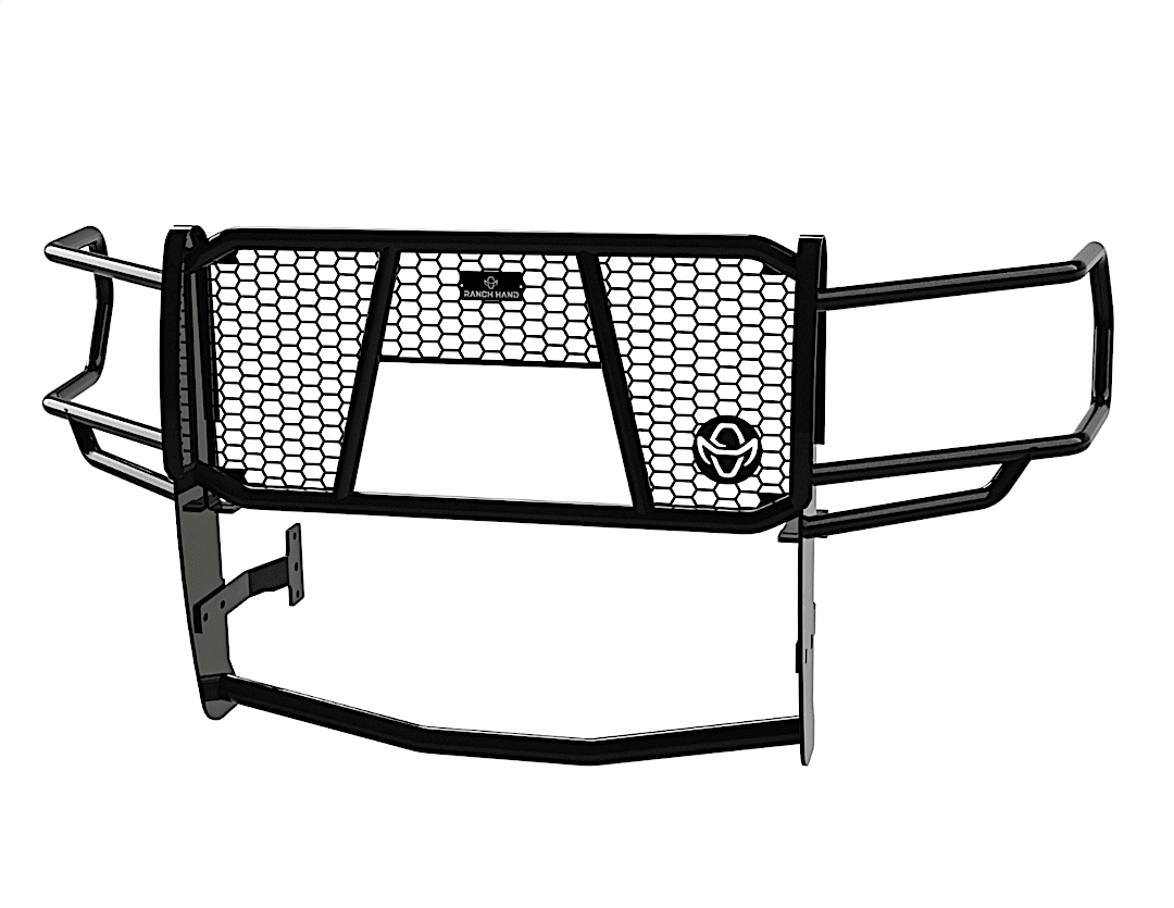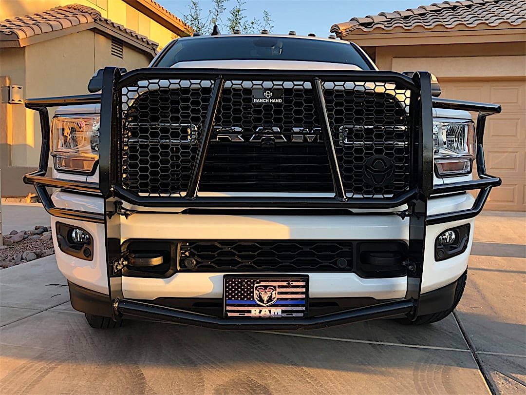 The Ranch Hand Legend grille guard features quality and style that is simply unmatched, making it one of the true icons of the aftermarket truck accessories industry. It has a one-piece, fully welded construction and is frame-mounted for maximum strength and to eliminate vibration. The grille guard is made with 12-gauge tubing and has punched grille inserts specifically designed to match the make and model of the truck. No expanded metal is used, ensuring a firm, sturdy design that you can depend on. The Legend also features wraparound brush guards for superior front-end protection and a streamlined appearance, adding a sleek and aggressive look to the truck. It is finished with a durable black powder coating, and each is made to fit a unique truck or SUV for a bold upgrade without the need to modify the front bumper. This particular Legend grille guard fits select model years of the Ram 2500 and Ram 3500 (see application info to verify fitment). Originally referred to as the “Donkey Knocker” due to its strength and solid, one-piece design, the Legend is the grille guard that improves look of your truck while providing unquestionable protection to make it through the rigors of the daily grind.