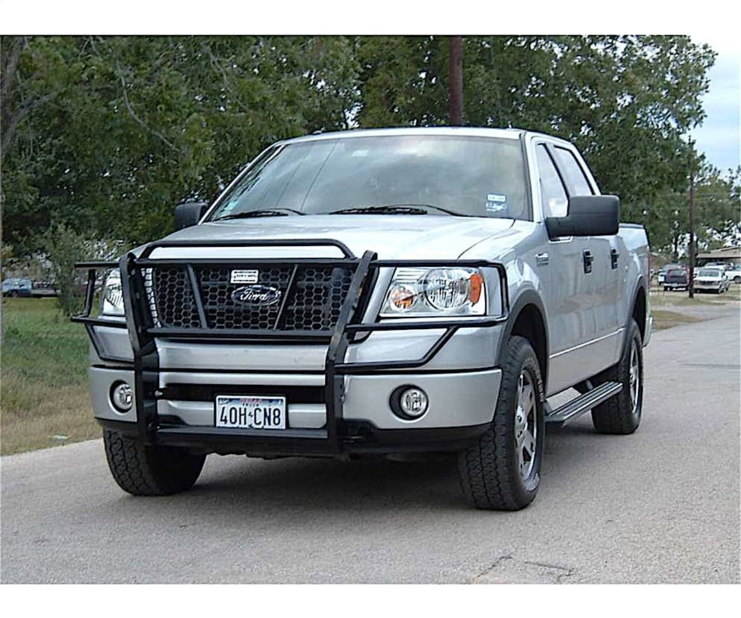 The Ranch Hand Legend grille guard features quality and style that is simply unmatched, making it one of the true icons of the aftermarket truck accessories industry. It has a one-piece, fully welded construction and is frame-mounted for maximum strength and to eliminate vibration. The grille guard is made with 12-gauge tubing and has punched grille inserts specifically designed to match the make and model of the truck. No expanded metal is used, ensuring a firm, sturdy design that you can depend on. The Legend also features wraparound brush guards for superior front-end protection and a streamlined appearance, adding a sleek and aggressive look to the truck. It is finished with a durable black powder coating, and each is made to fit a unique truck or SUV for a bold upgrade without the need to modify the front bumper. This particular Legend grille guard fits select model years of the Ford F-150 (see application info to verify fitment). Originally referred to as the “Donkey Knocker” due to its strength and solid, one-piece design, the Legend is the grille guard that improves look of your truck while providing unquestionable protection to make it through the rigors of the daily grind.