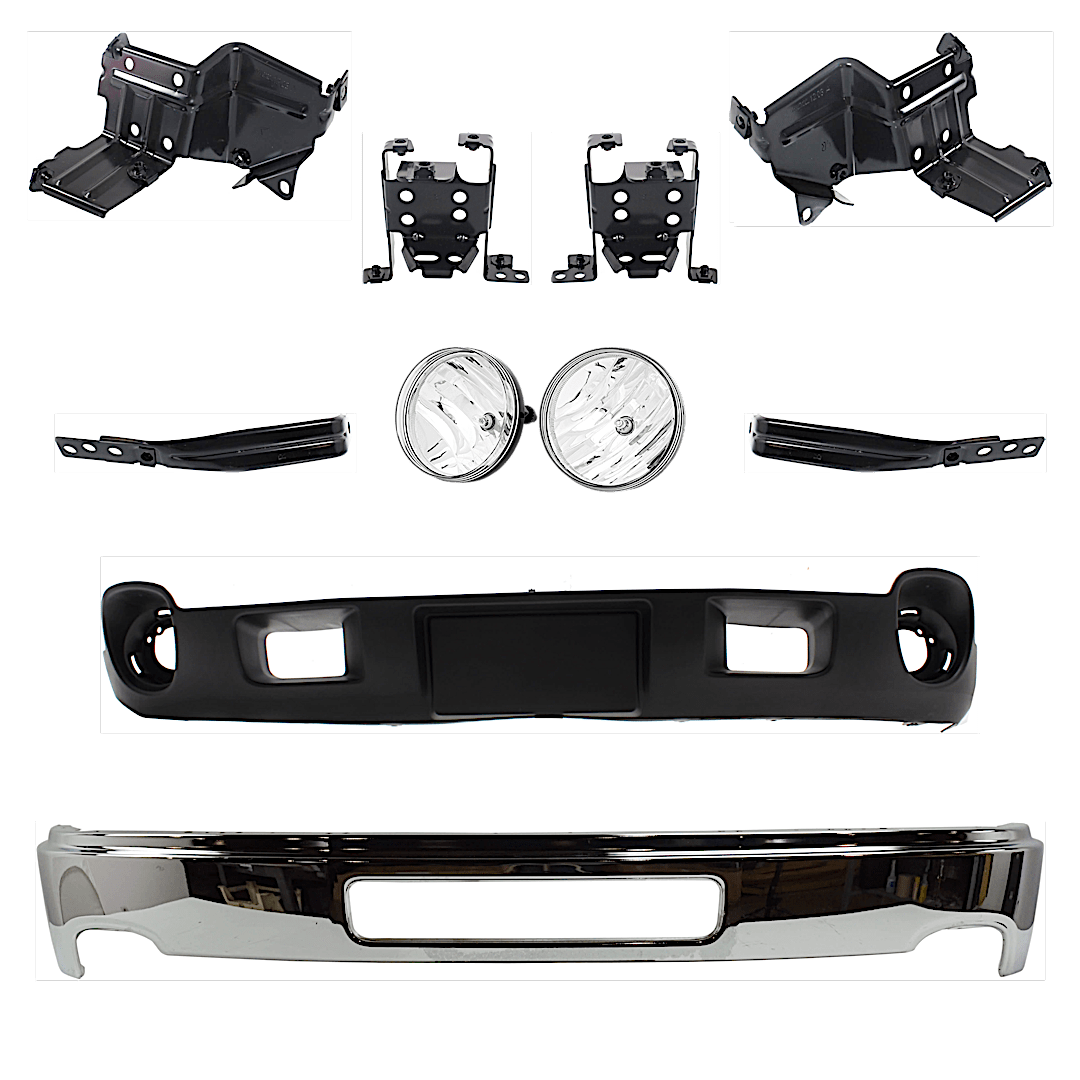 Replacement 10-Piece Kit Front Bumper, Chrome, Includes (1) Bumper, (6) Bumper Bracket, (2) Fog Light, and (1) Valance