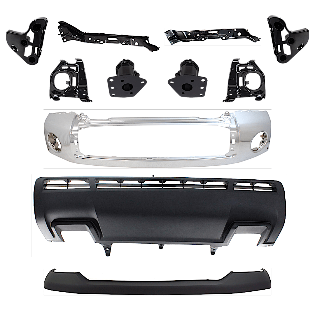 Replacement 11-Piece Kit, Front Bumper, For Models with Steel Bumper, Chrome, Includes (1) Bumper, (6) Bumper Bracket, (1) Bumper Cover, (2) Bumper Retainer, and (1) Valance
