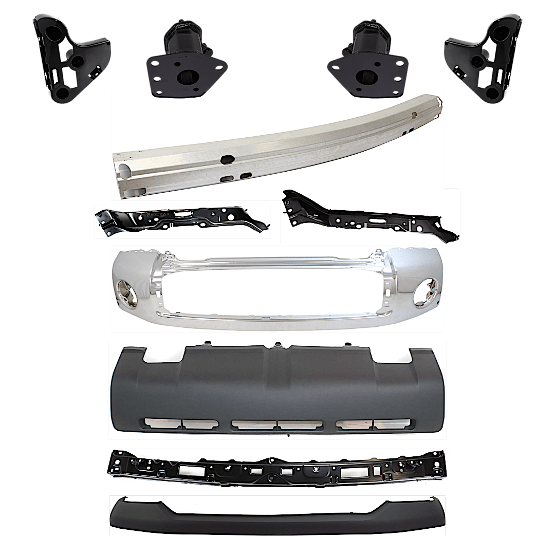 Replacement 11-Piece Kit, Front, Driver and Passenger Side Bumper, For Models w/ Steel Bumper, Includes (1) Bumper, (4) Bumper Bracket, (1) Bumper Cover, (1) Bumper Reinforcement, (3) Bumper Retainer, (1) Valance