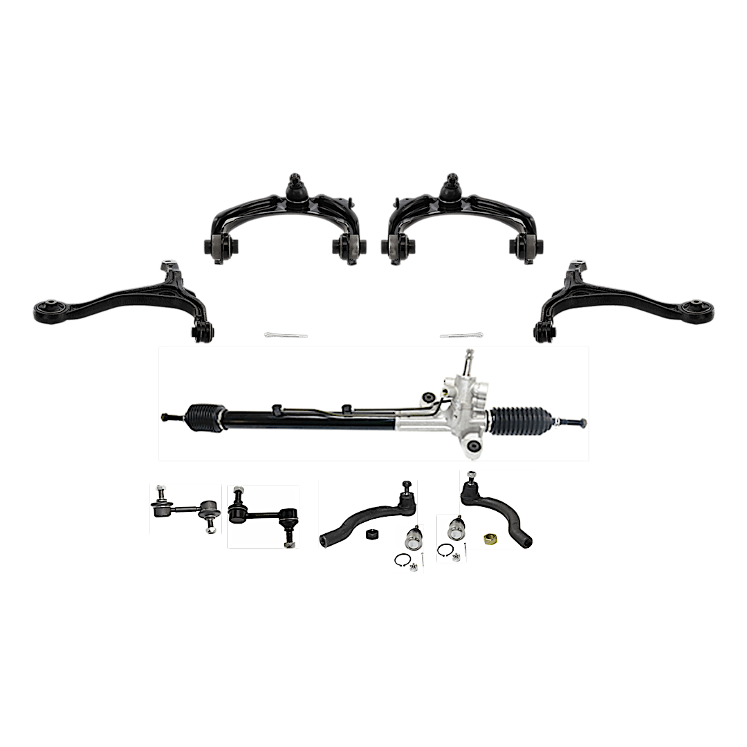 Replacement 11-Piece Kit Steering Rack, With Hydraulic Power, includes (2) Ball Joint, (4) Control Arm, (1) Steering Rack, (2) Sway Bar Link, and (2) Tie Rod End