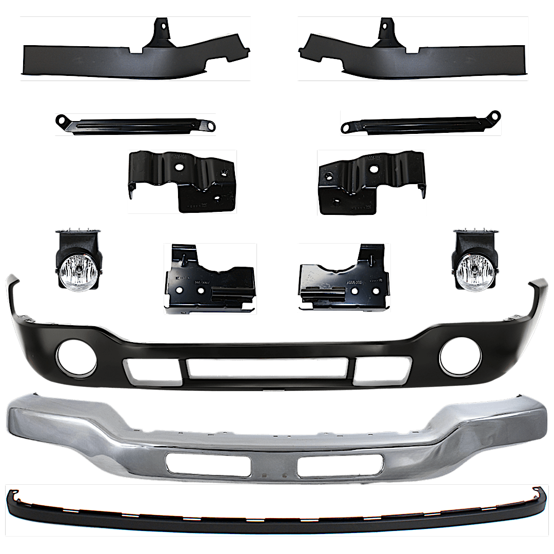 Replacement 13-Piece Kit, Front Bumper, Chrome, Includes (1) Bumper, (6) Bumper Bracket, (1) Bumper Cover, (2) Bumper Trim, (2) Fog Light, and (1) Valance