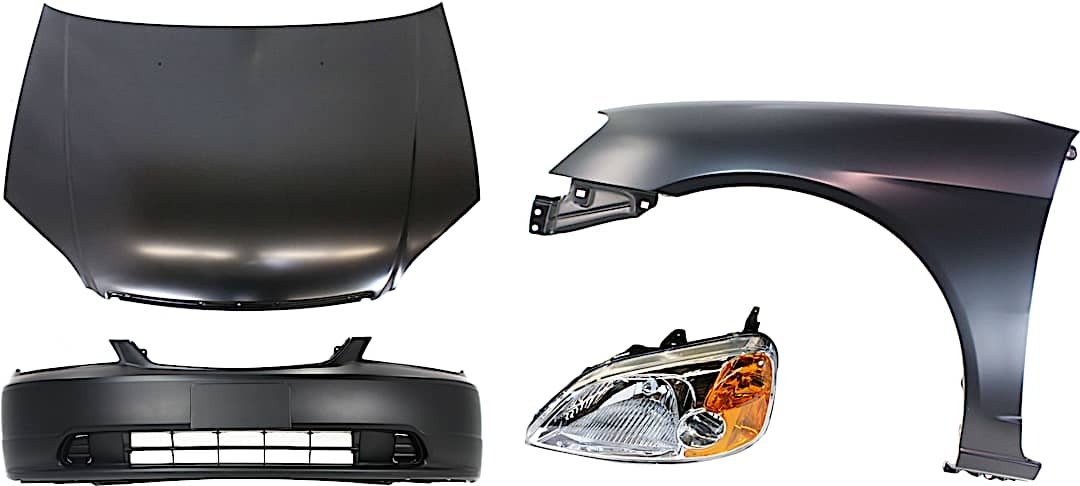 Replacement 4-Piece Kit Factory Style Hood, Coupe, Steel, Primed, Includes (1) Bumper Cover, (1) Fender, (1) Headlight, and (1) Hood