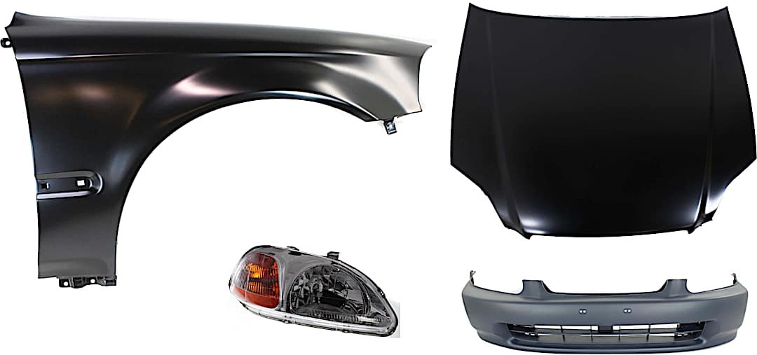 Replacement 4-Piece Kit Factory Style Hood, Steel, Primed, Includes (1) Bumper Cover, (1) Fender, (1) Headlight, and (1) Hood