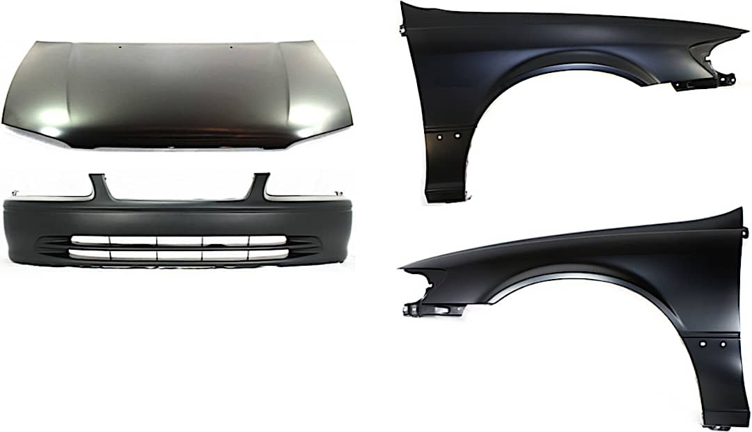 Replacement 4-Piece Kit Factory Style Hood, USA Built Vehicle, Steel, Primed, Includes (1) Bumper Cover, (2) Fender, and (1) Hood
