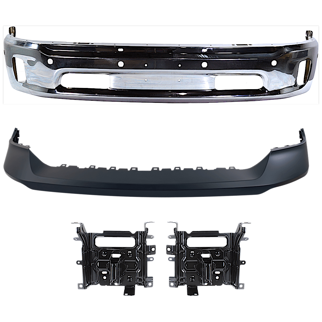 Replacement 4-Piece Kit, Front, Upper and Lower Bumper, For Models With Two Piece Bumper Type, Chrome, Includes (1) Bumper, (2) Bumper Bracket, and (1) Bumper Cover