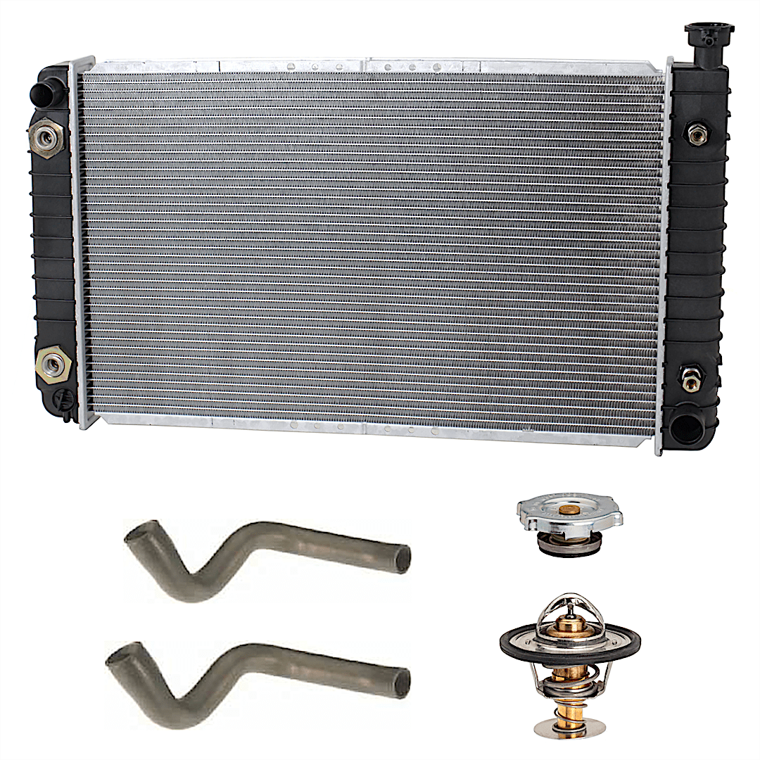 Replacement 5-Piece Kit Radiator, with Radiator Cap, Radiator Hoses, and Thermostat, 8 Cylinder, Aluminum Core, Plastic Tank, 28 in. Core Width, With Engine Oil Cooler, Measures 28-inches Between Tanks