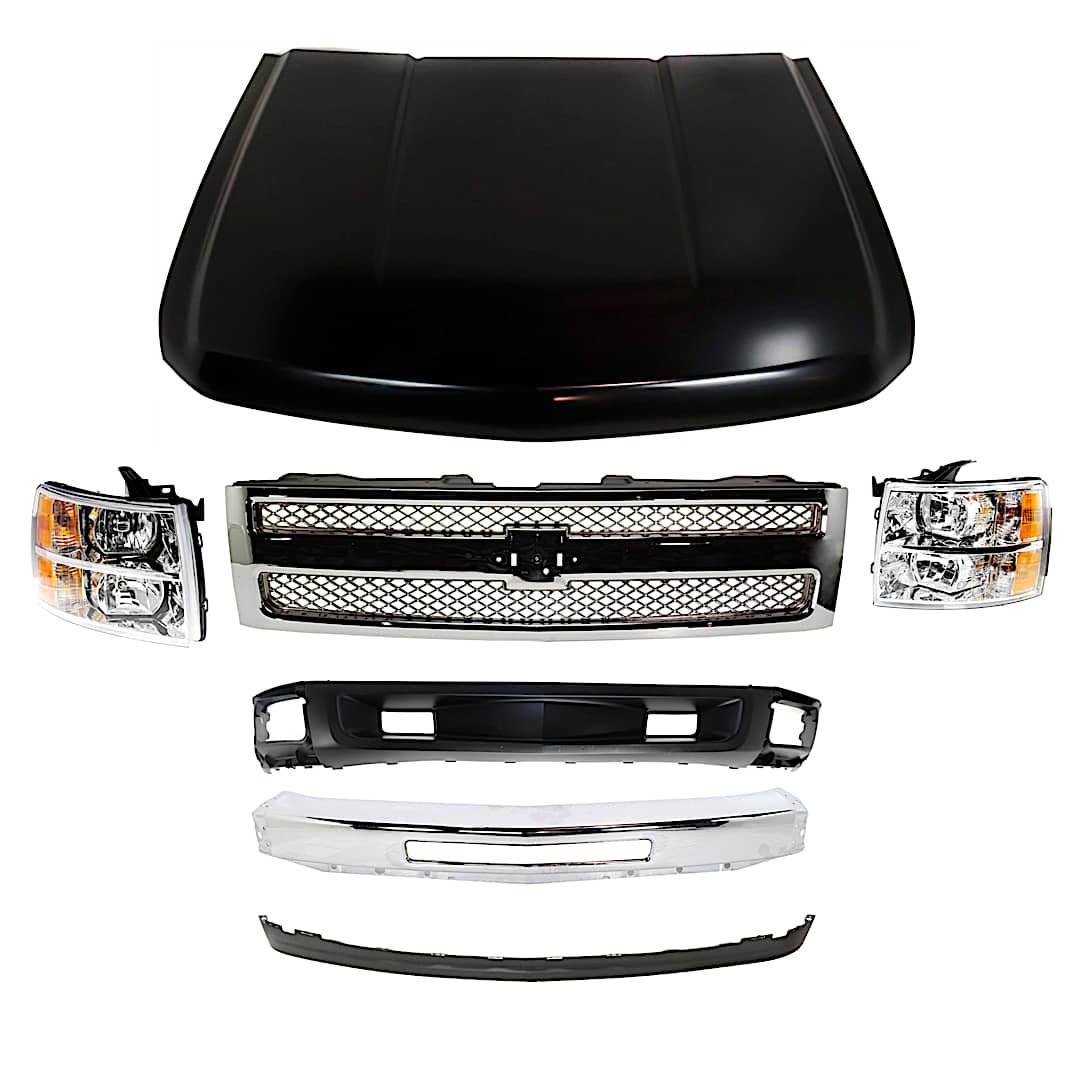 Replacement 7-Piece Kit, Front Bumper, Chrome, Includes (1) Bumper, (1) Grille, (2) Headlight, (1) Hood, and (2) Valance