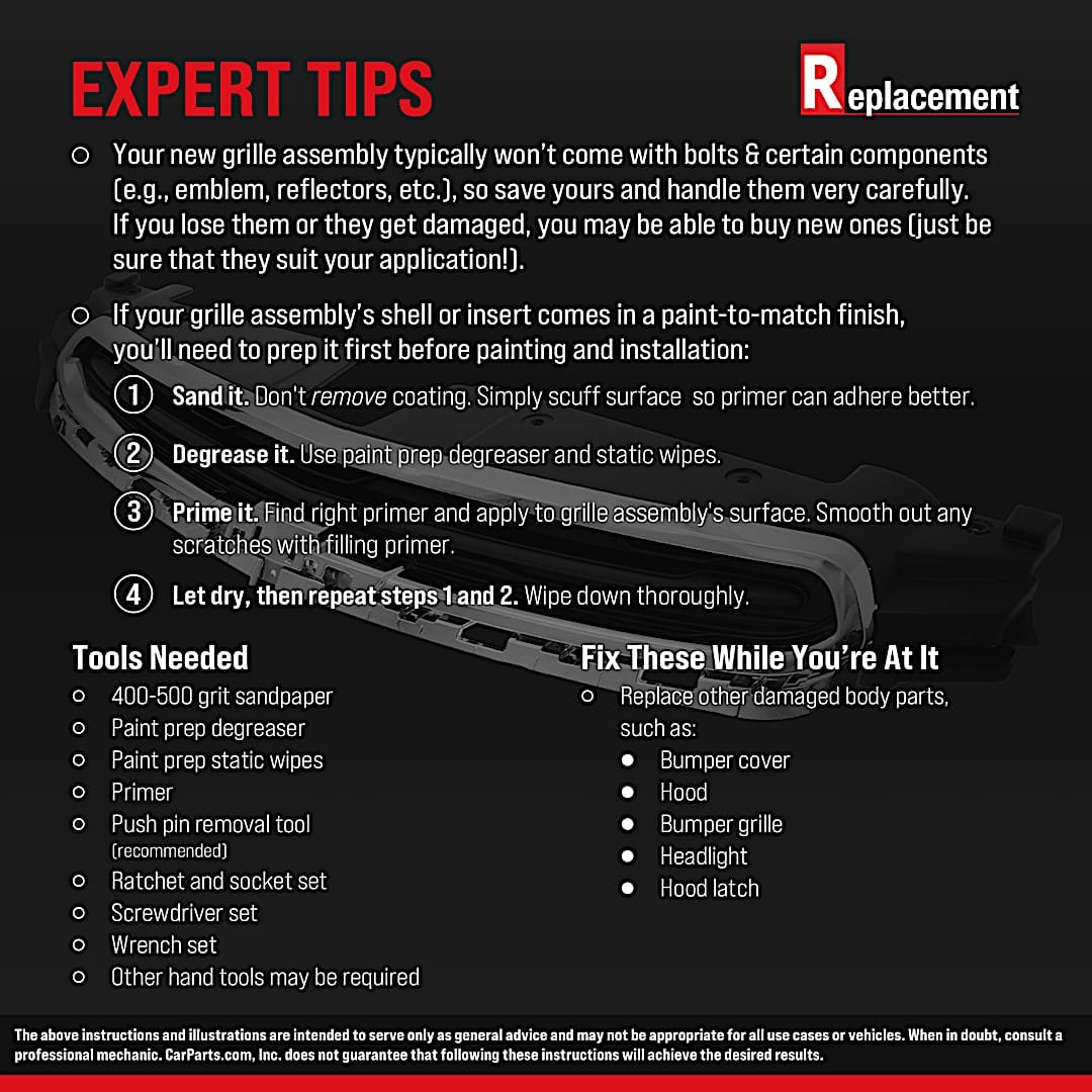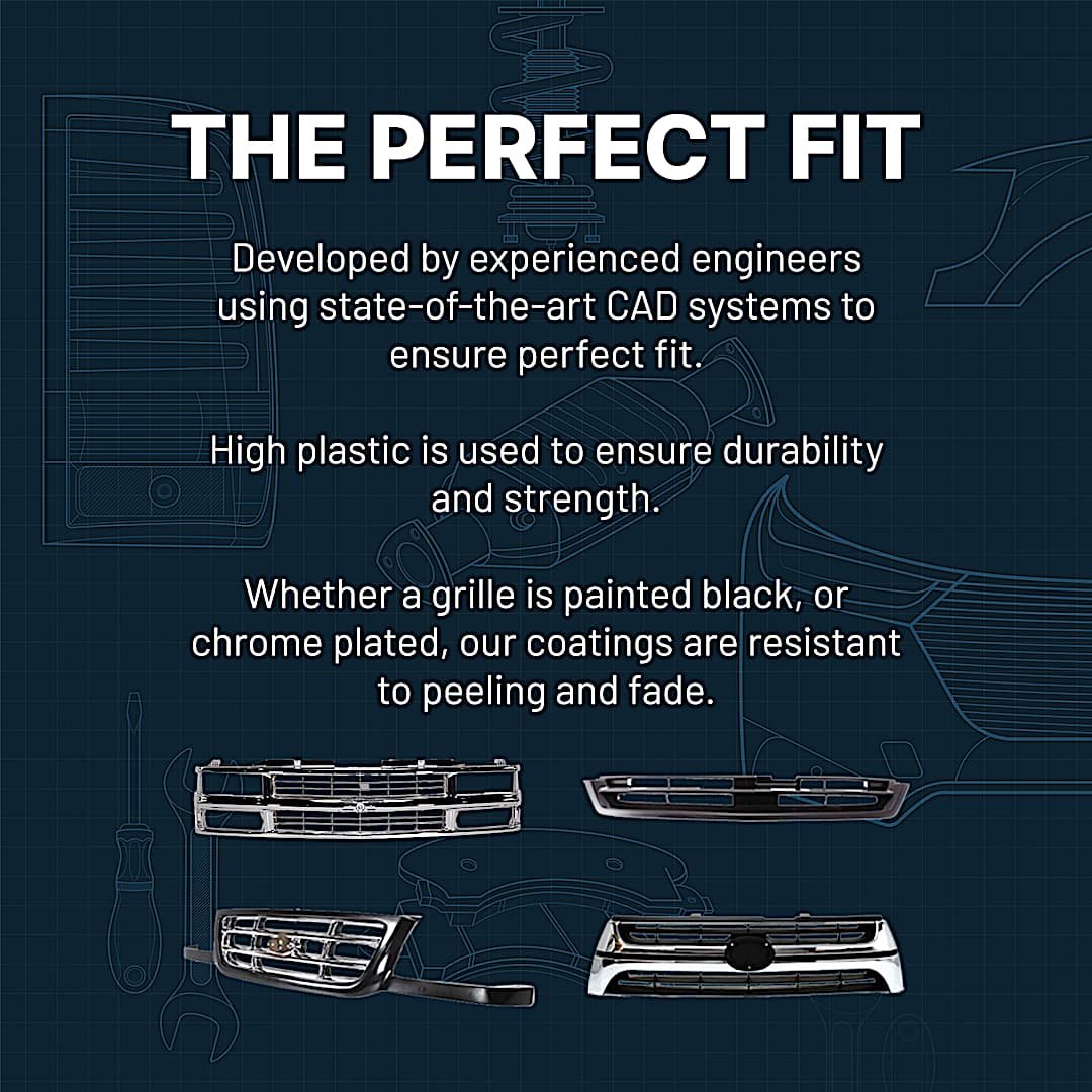 - Each Replacement brand grille assembly is manufactured using the same processes as the original, ensuring excellent fitment and a quality finish.