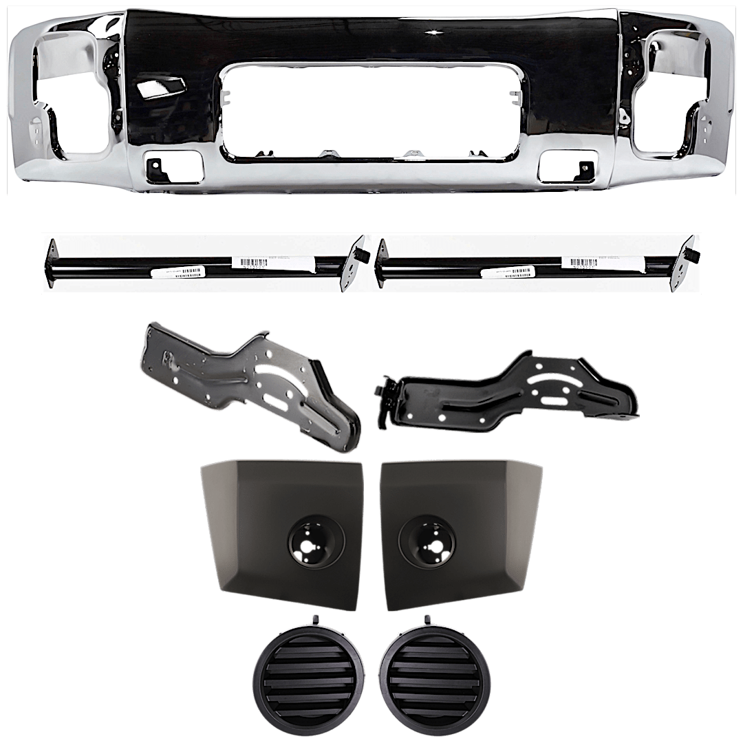 Replacement 9-Piece Kit, Front Bumper, Chrome, Includes (1) Bumper, (4) Bumper Bracket, (2) Bumper End, and (2) Fog Light Cover