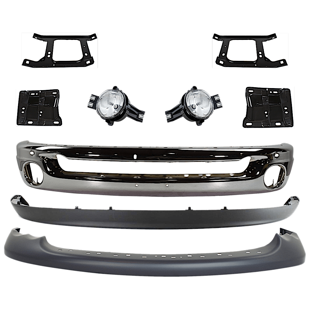 Replacement 9-Piece Kit, Front Bumper, Chrome, Includes (1) Bumper, (4) Bumper Bracket, (2) Fog Light, and (2) Valance