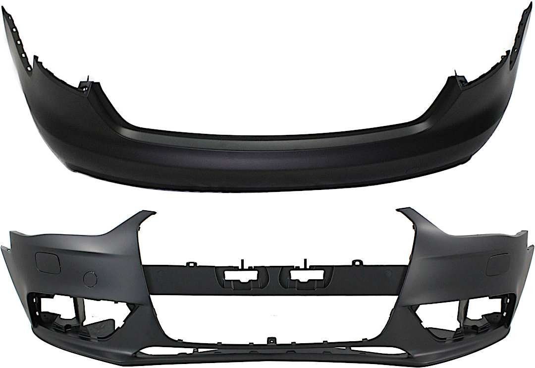 Replacement Front and Rear Primed Bumper Cover, Sedan, For Models Without S-Line Package, With Fog Light Holes, Without Parking Aid Sensor Holes, With Headlight Washer Holes, Without Warning System