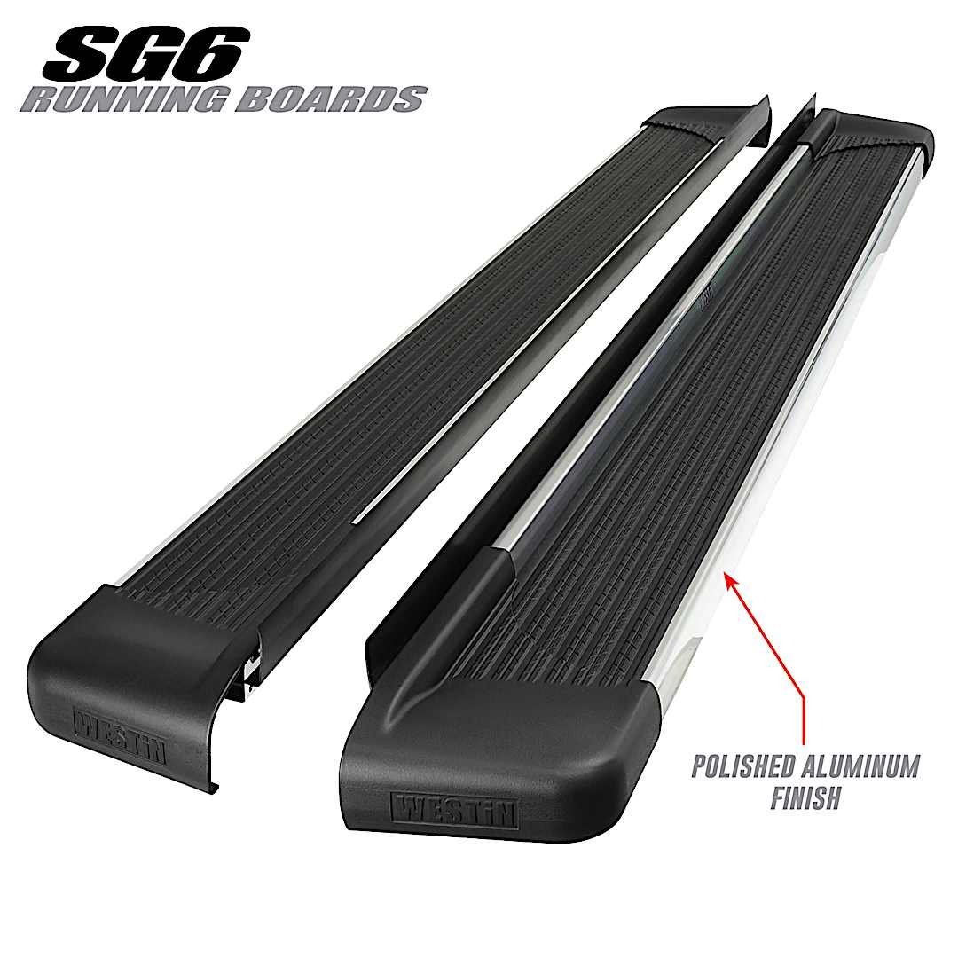 Westin’s SG6 Running Boards feature textured slip resistant step pads enhancing footing in virtually all weather conditions. They feature rocker panel gap strip for a finished look and a polished aluminum finish with a protective anodized coating for increased durability and extended product life.